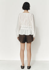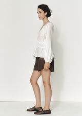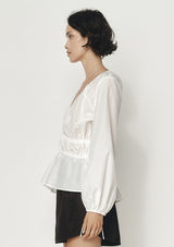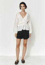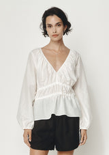The Derya Top from Marle features a gathered deep V-neckline and long sleeves with a subtle balloon silhouette, finished with a tie detail. The body has a subtle A-line silhouette, created by two gathered channels that can be adjusted by ties at the side. Crafted in a beautifully textured cotton and silk cloth, this lightweight top is the perfect piece to carry you through to the warmer months.