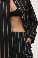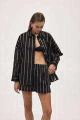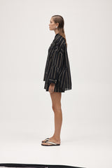 The Edie Shirt features a standard collar, secured with shell buttons down the centre front. This shirt has an oversized and boxy fit with an A-line silhouette through the body, falling slightly longer at the back. This shirt has wide, long sleeves, finished with two shell buttons at the cuff. This version is crafted in a lightweight cotton silk cloth with a black base and dark beige stripe. This fabric has a subtle sheerness