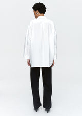 The Edie Shirt features a standard collar, secured with shell buttons down the centre front. This shirt has an oversized and boxy fit with an A-line silhouette through the body, falling slightly longer at the back. This shirt has wide, long sleeves, finished with two shell buttons at the cuff. This version is crafted in a lightweight cotton silk cloth with a black base and dark beige stripe. This fabric has a subtle sheerness