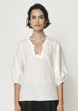 The Esma Top from Marle features elongated t-shirt sleeves with a subtle balloon silhouette, secured with a single shell button. The rouleau tie on the deep neckline can be threaded through different loops to create varying finishes. This top is crafted from 100% linen and is the perfect piece to carry you through to the warmer months.