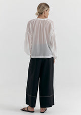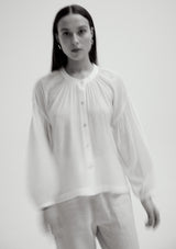 The Joseph Shirt by Marle is crafted from 100%Tencel. This shirt features a drop shoulder and slightly balloon sleeves that can be worn long or pushed up to create a more dramatic shape. It has a flattering round neckline with button down front.