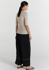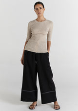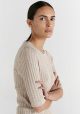 The Layla Tee by NZ designer is knitted in a luxuriously soft custom rib cotton / merino yarn. It has elongated sleeves that sit just above the elbow and features a thicker rib stitch detail around the neck and sleeves. This piece is perfect on its own or can be layered under your favourite summer dresses.