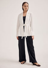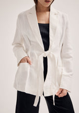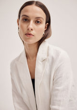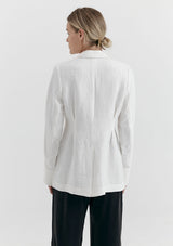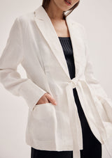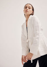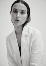 The Lenny Jacket by Marle is crafted in 100% Linen. This blazer features two exaggerated tucks down the front that create a feminine shape through the body. The jacket is secured by a tie on either side, these can be knotted together or worn loose. There are two jet pockets on the front and the long sleeves are finished with an oversized cuff.