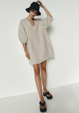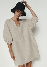 The Lunie Dress from Marle features elongated t-shirt sleeves with a subtle balloon silhouette, secured with a single shell button. The rouleau tie on the deep neckline can be threaded through different loops to create varying finishes. This mini dress is crafted from 100% linen and is the perfect piece to carry you through to the warmer months.