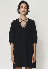 The Lunie Dress from Marle features elongated t-shirt sleeves with a subtle balloon silhouette, secured with a single shell button. The rouleau tie on the deep neckline can be threaded through different loops to create varying finishes. This mini dress is crafted from a linen blend fabrication and is the perfect piece to carry you through to the warmer months.