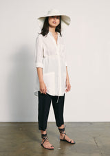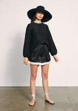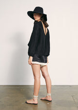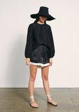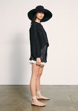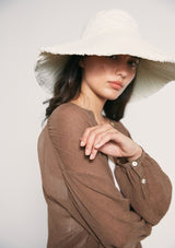 The Oma Hat is made from a heavy weight cotton and features a frayed edge at the brim at where the brim meets the top of the hat.