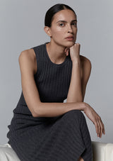 The Rita Dress is crafted in luxuriously soft supima cotton / merino. It is a fitted, mid-length dress with a flattering round neckline and singlet sleeve. It features the subtle detail of a godet at the back. Perfect on its own through spring and summer or layered with your favourite knitwear as the weather cools down.