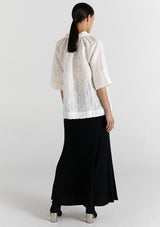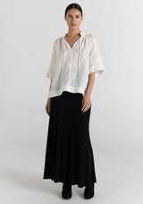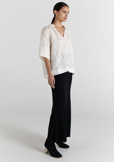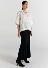 The Sanne Top by New Zealand designer is crafted in a beautiful check linen. It is a relaxed silhouette with a standing collar and feminine V-neck secured by a rouleau tie. It has an elongated sleeve with the subtle design detail of five tucks, finishing at a flattering elbow length.