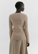 The Soren Top features a fitted silhouette, finely knitted in 100% Organic Cotton. It has a round neckline, long sleeves, and a subtle eyelet detail down the centre front and back.