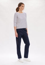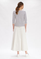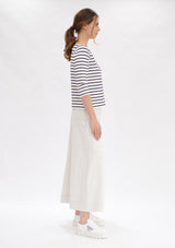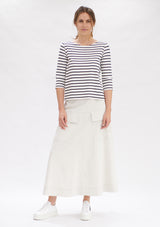 The Mela Purdie Relaxed Boatneck features a softly scooped boat neckline and 3/4 length sleeves. This style falls to the hip and is crafted from this seasons’ artisan stripe matte jersey, offering comfort, durability and stretch.