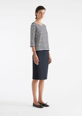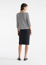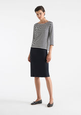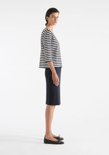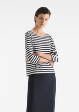 The Bevel Stripe Knit Relaxed Boatneck from Mela Purdie features a boat neckline with a ¾ length sleeve and a relaxed fit that falls to the hip. This is a must have essential for every wardrobe, offering optimal comfort and stretch. Crafted from a knit jersey fabrication in the timeless Boater Stripe.