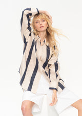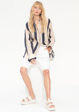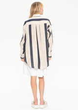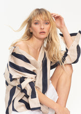 The Relaxed Pocket Shirt by Mela Purdie features a classic shirt collar with button down front opening, single pocket detail on front, full-length sleeves with cuffs and a longer length with a curved hemline. The slightly loose fit makes this the perfect overshirt to wear over slim pants. This versatile shirt is crafted from high quality European linen, Mela’s Block Stripe adds a hint of texture with a light airy feel, a contemporary addition to your summer wardrobe.