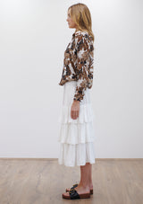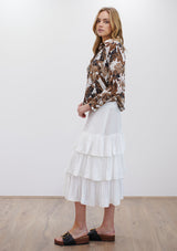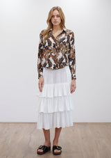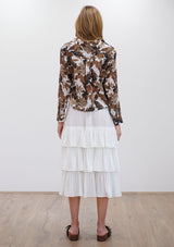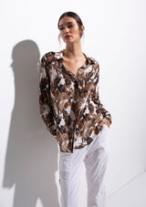 The Soft Shirt by Mela Purdie has been designed in Cabana Print. This classic silhouette features an open collar, button front with cover, and long sleeves with button cuff. Crafted from printed 100% Silk.