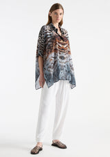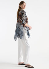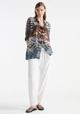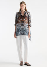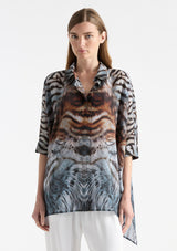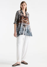 The Chisel Panama Shirt from Mela Purdie features a collar, concealed front placket with button closure, 3/4 length sleeves and a slighter longer A-line swing hem with side split openings. Cut from Mela's Silk Crepe De Chine, a luxuriously lightweight Silk boasting a sumptuous soft handle, matte surface and beautiful drape. The Canopy Desert print boasts a captivating animal print with rich colours creating a bold and timeless statement.