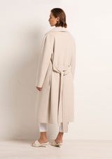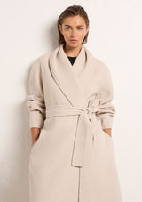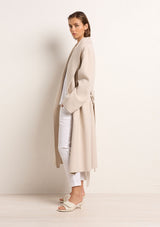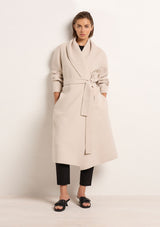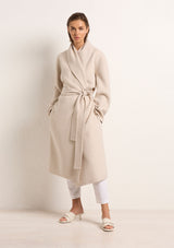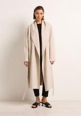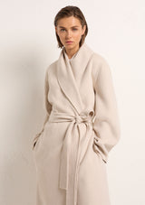 The Long Shawl Coat from Mela Purdie features an exaggerated collar and lapel, relaxed full length sleeves, side pockets, waist tie with belt loops at side seams and a longer length. Crafted in supremely soft, aerated Cashmere Felt and featuring artisan hand finished infinity edging, this coat is a cosy addition to your winter wardrobe.