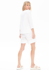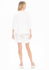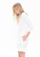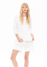 The Chalk Knit Boater Top from Mela Purdie features a relaxed 3/4 length sleeve and body, finishing just below the waistline. Crafted from a luxuriously soft and light Italian milled Cotton blend made exclusively for Mela Purdie.