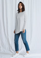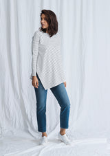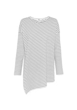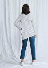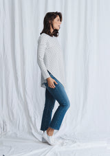 The Side on Sweater from Mela Purdie features a crew neckline, long sleeves and a relaxed silhouette with an asymmetrical hemline that falls just below the waistline. This designer top is crafted from Mela’s stretch fabrication, Compact Knit.