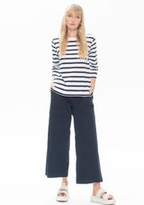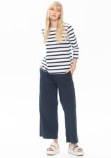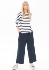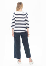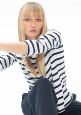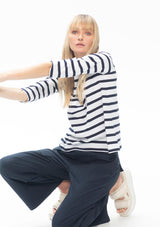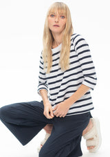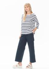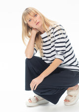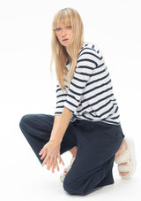 The Deck Stripe Chalk Knit Boater Top from Mela Purdie features a relaxed 3/4 length sleeve and body, finishing just below the waistline. Crafted from an Italian milled Cotton blend made exclusively for Mela Purdie in a true heritage stripe, sure to last for seasons to come.