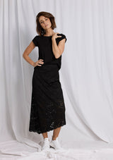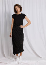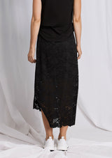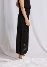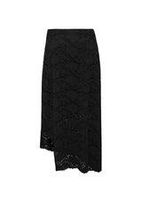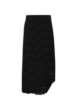 The Oblique Skirt is now available in the Mela Purdie Flannel Lace Knit. It features a mid-rise elastic waistband, an angled hemline with split detailing on the left, and a build in slip under the lace.