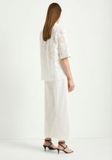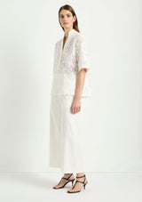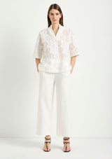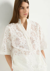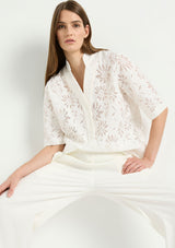 The Flute Plaza from Mela Purdie features a petite stand collar with exposed half button placket, 3/4 length sleeves and a straight hem. Crafted from Mela’s Flora Lace fabrication offering optimal comfort and stretch.