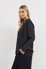 Classic Spirit Model is wearing a size 10 Glitter Stripe Zip Bomber Jacket in the colour Black/Gold