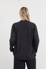 The Mela Purdie Glitter Stripe Zip Bomber Jacket is Crafted from Macro-Mousseline, a non-stretch fabrication. The Zip Bomber Jacket features a gold exposed zipper, long sleeves, a simple mandarin collar and pockets.