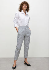Discover Mela Purdie's Indigo Stripe Popiline fabric, a two- tone vertical stripe, cotton, elastane blend with high stretch and a polished finish. The Nomad Pant features a tapered fit with a wide elasticated waistband