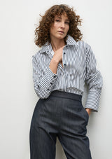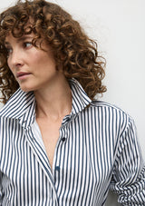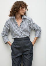 Discover Mela Purdie's Indigo Stripe Popiline fabric, a two- tone vertical stripe, cotton, elastane blend with high stretch and a polished finish. The Smooth Shirt offers a classic, crisp versatile wardrobe addition