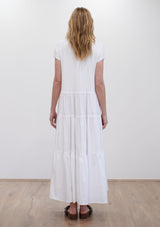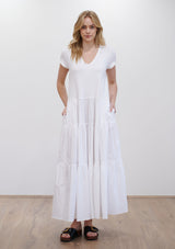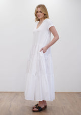 The Cap Botanica Dress from Mela Purdie features a V neck top with short sleeves, crafted from Matte Jersey and a gathered tiered detail bottom from the waist down that is crafted from Microprene. This dress is crafted from a mix of Matte Jersey and Microprene.
