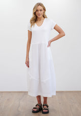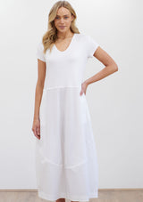 The Cap Sleeve Gondola Dress from Mela Purdie features a V neckline, cap sleeves and an A line shaped body with curved seam detail panelling. The top portion of this dress is crafted from Matte Jersey and from the waist down it is crafted from Microprene - this dress is crafted from a mix of Matte Jersey and Microprene.