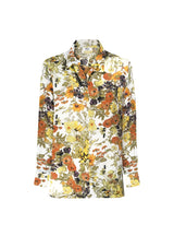 This designer shirt features a bright floral design in an open collar, button front with cover and long sleeves with button cuff.