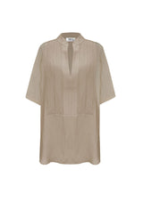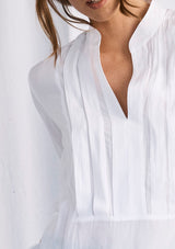 The Accordion Top is crafted from Mela’s non-stretch fabrication, Machè. This designer top features a v-neckline, 3/4 sleeves with cuff, straight hemline and placket detailing on the back.
