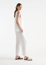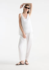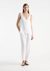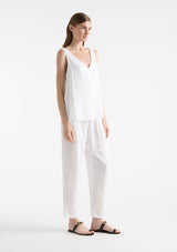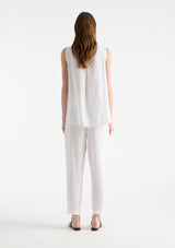 The Mela Purdie Audrey Tank features a soft V Neckline, "Closed in' back and slightly longer hemline at the back. This tank has been fitted with doubled fabric front making it non-transparent in all colours. Crafted from Macro-Mousseline; a fabric that drapes like a silk but can be machine washed. This is a travel essential and everyday dressing must have.