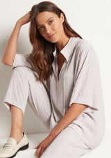 The Mache Bevel Neck Plaza from Mela Purdie features a petite stand collar with a subtle V neckline, wide pleat detailing at front, ¾ length sleeves and finished with a straight hemline. This elegant top is crafted from 100% technical polyester. Mache offers a full bodied, high fashion look that combines style and comfort in a user-friendly fabrication that is machine washable and ideal for travel.