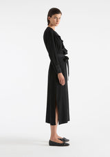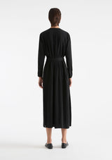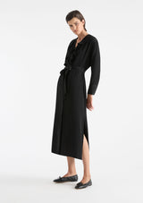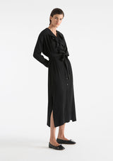 The Billow Dress from Mela Purdie features a V-neckline with soft ruffle detail, full length sleeves with buttoned cuffs, side pockets, full front placket with button closure, back pleat detail, waist tie with belt loops at side seams and a straight hemline with splits at side seams. This elegant dress is crafted from 100% technical polyester, Mache offers a full bodied, high fashion look that combines style and comfort in a user-friendly fabrication that is machine washable and ideal for travel.