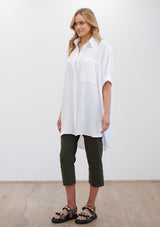 The Cabana Shirt by Mela Purdie features a collar with button down front opening, single pocket detail and ¾ sleeves. This oversized shirt is crafted from 100% technical polyester; Mache offers a full bodied, high fashion look that combines style and comfort in a user-friendly fabrication, that is machine washable and ideal for travel.