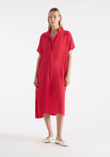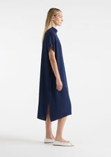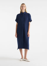 The Cylinder Wedge Dress by Mela Purdie features a nehru collar with button up covered placket, cap sleeves and side split detail at the hem. Crafted from 100% technical polyester, Mache offers a full bodied, high fashion look that combines style and comfort in a user-friendly fabrication, that is machine washable and ideal for travel.