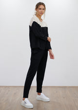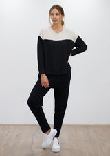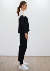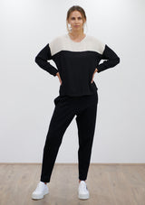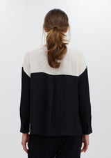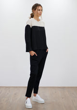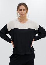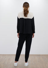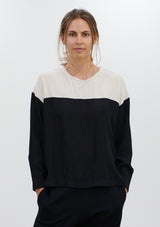 The Duo Blouse by Mela Purdie features a crew neck, dropped shoulder and long sleeves. Crafted from 100% technical polyester, Mache offers a full bodied, high fashion look that combines style and comfort in a user-friendly fabrication, that is machine washable and ideal for travel. Available spliced colour options to elevate your leisurewear.