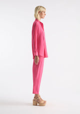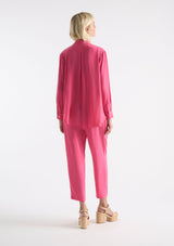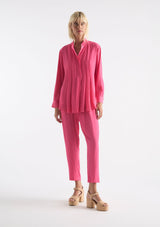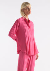 The Duo Pleat Shirt from Mela Purdie features a stand collar with a concealed front placket. This shirt offers subtle luxurious detailing with pleat folds through the bust and firm fitting cuffed sleeves. Crafted from Mela’s non-stretch fabrication, Machè. Mache offers a full bodied, high fashion look that combines style and comfort in a user-friendly fabrication, that is machine washable and ideal for travel.