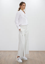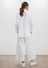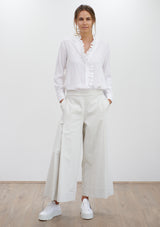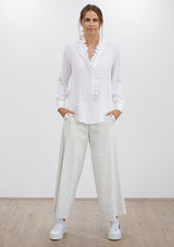The Mache Flute Frill Shirt by Mela Purdie features a mandarin collar with frill detail, a full-length sleeve with cuff and slight curved hemline. Cut for a classic relaxed fit and crafted from Mache.