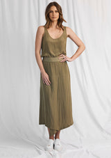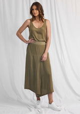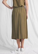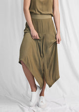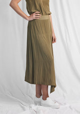 The Fold Skirt is crafted from Mela’s non-stretch fabrication, Machè. The Fold Skirt features an A-line mid length design, elastic waistband and an asymmetrical hemline that folds at the front.