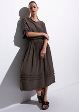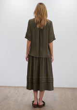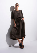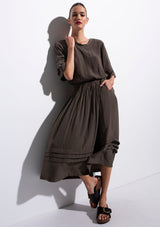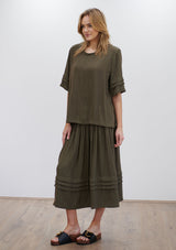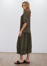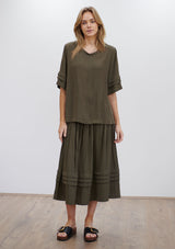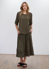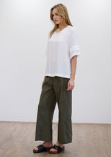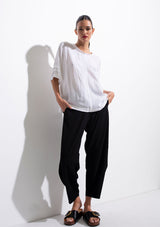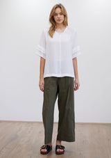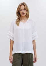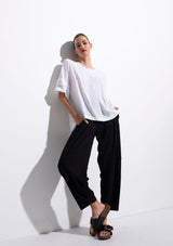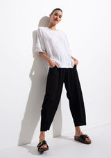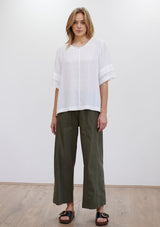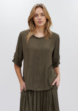 The Harmony T from Mela Purdie features a U shaped neckline, front centre seam detail with splice detail panelling on the ¾ sleeve. Crafted from Mela’s non-stretch fabrication, Mache. Mache offers a full bodied, high fashion look that combines style and comfort in a user-friendly fabrication that is machine washable and ideal for travel.