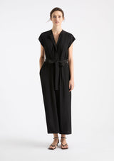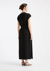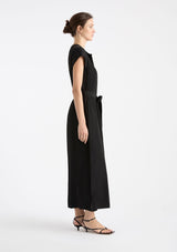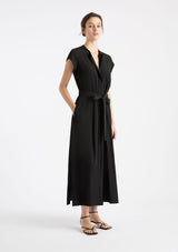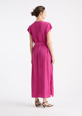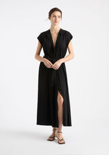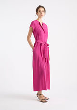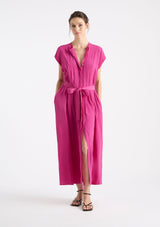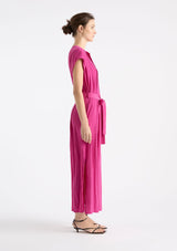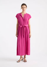 The Knife Pleat Dress from Mela Purdie features a round neckline, cap sleeves, side pockets, concealed front placket with button closure and pleat detailing either side, back pleat detail, waist tie with belt loops at side seams and a straight hemline with splits at side seams. This elegant dress is crafted from 100% technical polyester, Mache offers a full bodied, high fashion look that combines style and comfort in a user-friendly fabrication that is machine washable and ideal for travel.