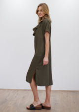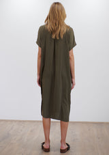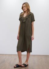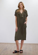 The Pendant Wedge Dress by Mela Purdie features a V soft ruffled neckline with cap sleeves, a yoke at the waist and a straight hem with side splits . Crafted from 100% technical polyester, Mache offers a full bodied, high fashion look that combines style and comfort in a user-friendly fabrication that is machine washable and ideal for travel.