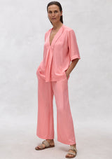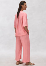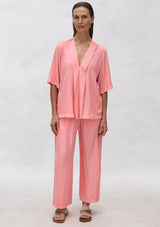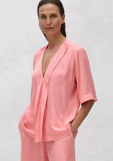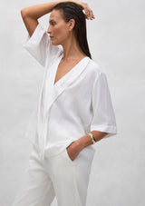 The Ribbon Edge Plaza from Mela Purdie features a subtle V neckline and a soft ruffle front detail, capped sleeves and finished with a straight hemline. Crafted from Mela’s non-stretch fabric, Mache, it offers a relaxed fluidity and smooth lustre surface, blending style and comfort in a user-friendly, machine washable fabric ideal for travel.
