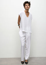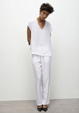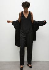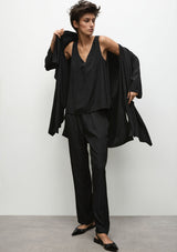 The Savoy Pant from Mela Purdie features an elasticated waist, pockets at hips and a standard rise with a tapered, full length silhouette. This pant is crafted from 100% technical polyester, Mache offers comfort and a fluid high fashion look that combines style and comfort in a user-friendly fabrication that is machine washable and ideal for travel.