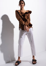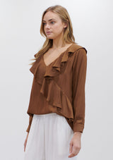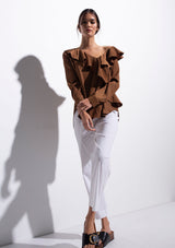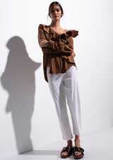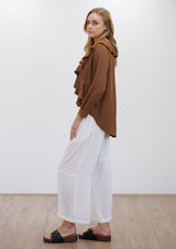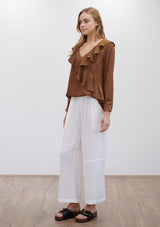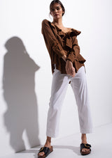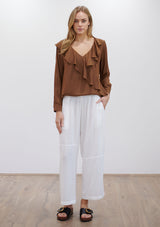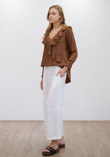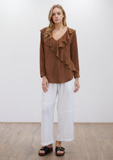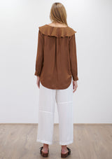 The Scroll Blouse by Mela Purdie features a V neckline with ruffle detailing, long sleeves and a relaxed fit which flows down from the bust. Crafted from Mela Purdie’s non-stretch fabrication, Mache. Mache offers a full bodied, high fashion look that combines style and comfort in a user-friendly fabrication, that is machine washable and ideal for travel.