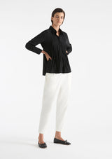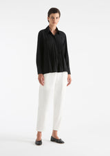 The Straw Pleat Shirt from Mela Purdie features a classic shirt collar, concealed front placket with button opening, pleat detailing, full length sleeves with buttoned cuffs, pleat at the back and a relaxed silhouette with a hemline that falls at the hips. This top is crafted from 100% Technical Polyester; Mache offers a full bodied, high fashion look that combines style and comfort in a user-friendly fabrication, that is machine washable and ideal for travel.