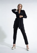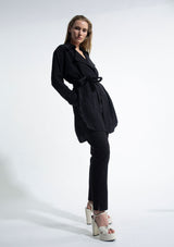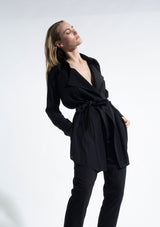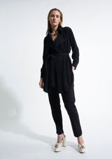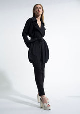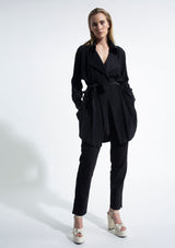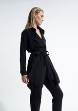 The Trench Overshirt by Mela Purdie features a soft draped front with a generous trench collar, full-length sleeves, back pleat detailing and a scooped hemline. This elegant overshirt can be worn with or without the soft-tie belt. Crafted from 100% technical polyester, Mache offers a full bodied, high fashion look that combines style and comfort in a user-friendly fabrication, that is machine washable and ideal for travel.