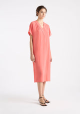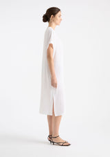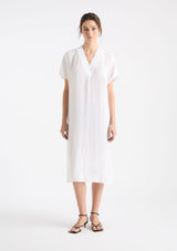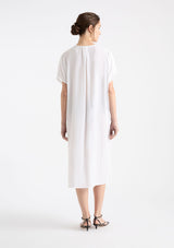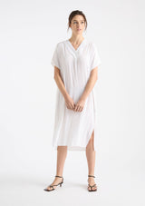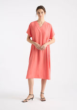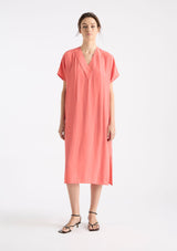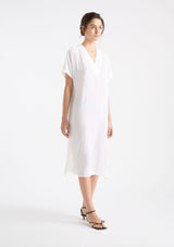The Venice Wedge from Mela Purdie features an over lay V-neckline, short sleeves, side pockets and a mid-length hemline with side splits. Crafted from Mela’s non-stretch fabrication, Mache, a lustrously lightweight and fast-drying fabrication.
